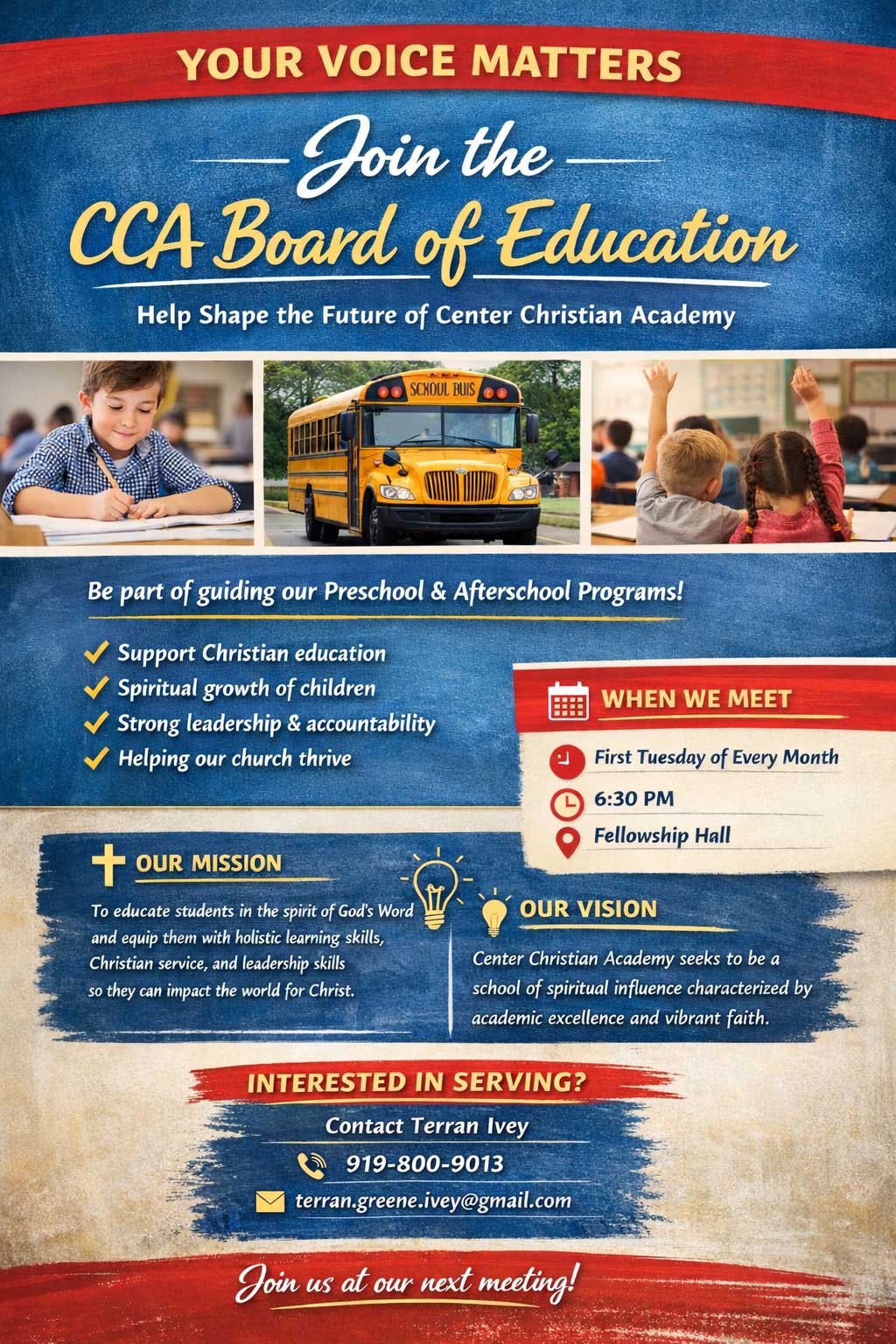 Center Christian Academy is seeking individuals who are interested in serving on the CCA Board of Education and helping shape the future of our preschool and afterschool programs. This is an opportunity to support Christian education, encourage the spiritual growth of children, and provide strong leadership and accountability while helping our church and school community thrive.